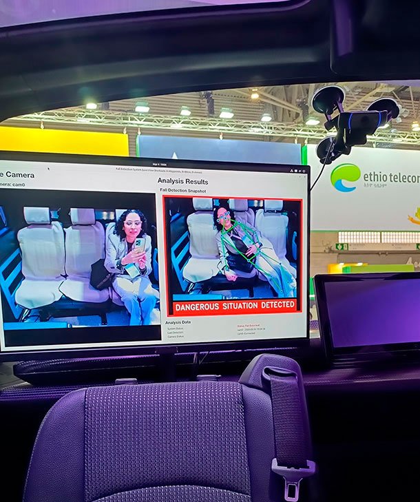 No espaço dedicado aos veículos autônomos, os visitantes puderam entrar em um modelo de Nível 4, desenvolvido em parceria com a TIER IV, capaz de operar sem motorista. A demonstração mostrou como câmeras com IA podem detectar automaticamente situações de emergência, como um mal súbito, contribuindo para aumentar a segurança na mobilidade.